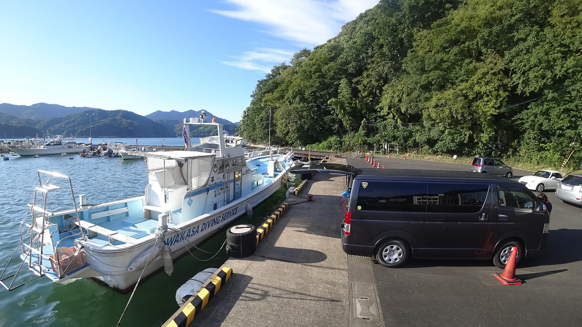 船の前の駐車スペース(無料)へ時間には余裕を持ってお集まりください。